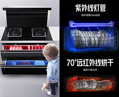 紫外線燈管,破壞細(xì)菌DNA雙鏈,70°遠(yuǎn)紅外線烘干,餐具干爽更潔凈。